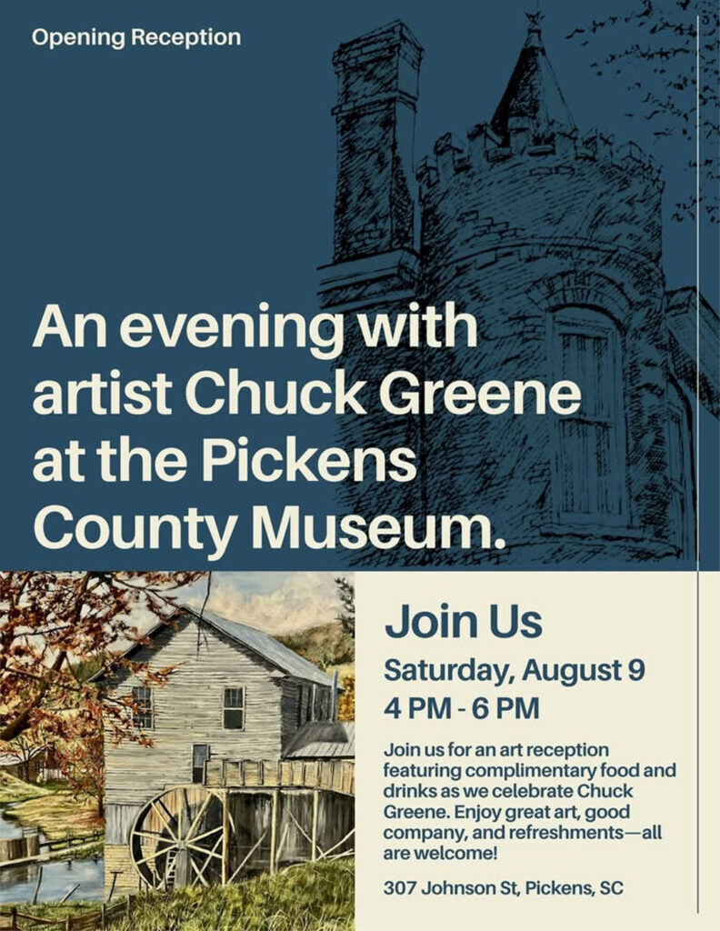 Join the Pickens County Museum of Art & History for an art reception on Saturday, August 9 from 4 p.m. to 6 p.m. featuring complimentary food and drinks as we celebrate Chuck Greene. Enjoy great art, good company, and refreshments—all are welcome!