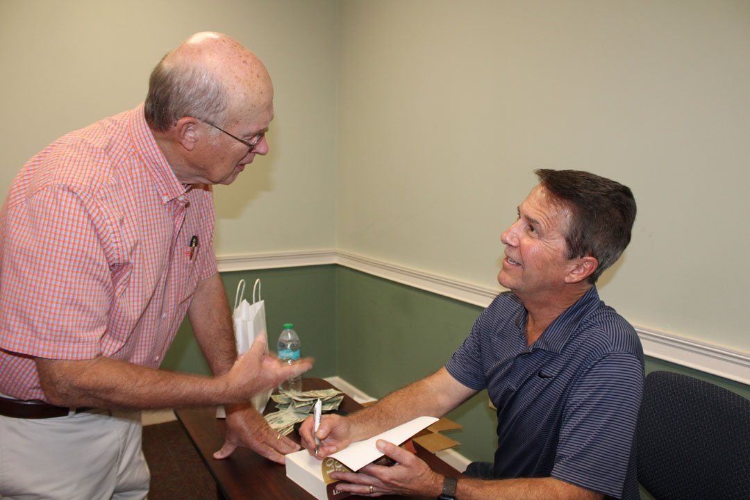 Senator Larry Martin and author Charles Hood speak following the Author Talk, as Hood signs for Martin a copy of his new book, Looking for Space: My Pickens Journey. (Photo by Karen Brewer, The Pickens County Chronicle)