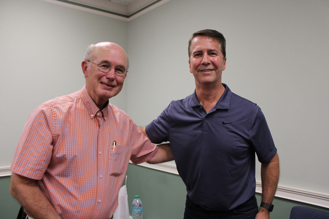 Senator Larry Martin, of Pickens, and Charles Hood pose for a photograph following the Author Talk at the Pickens Village Library in which Hood spoke and read selections from his new book about his hometown, Looking for Space: My Pickens Journey. (Photo by Karen Brewer, The Pickens County Chronicle)