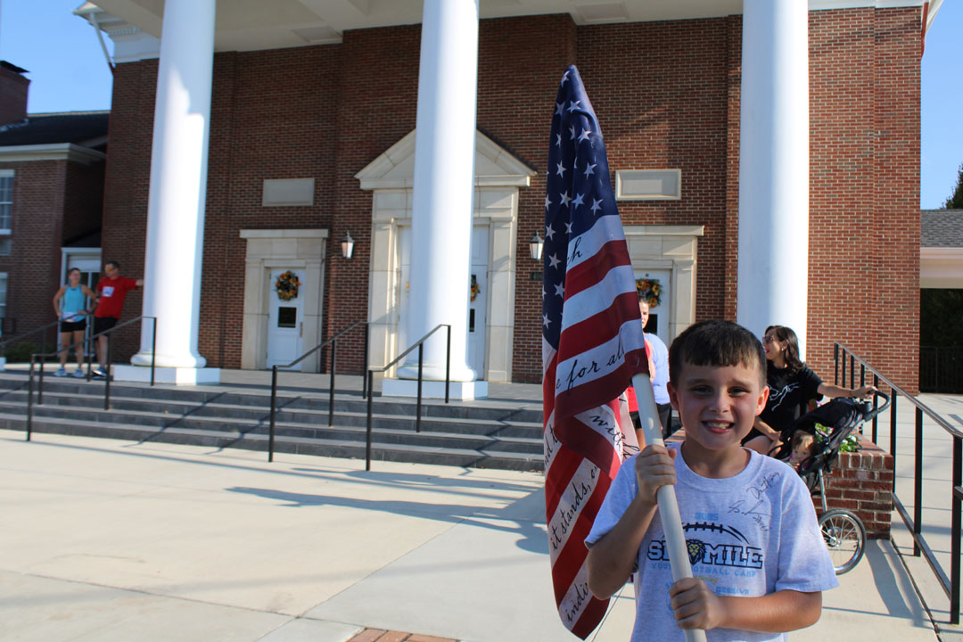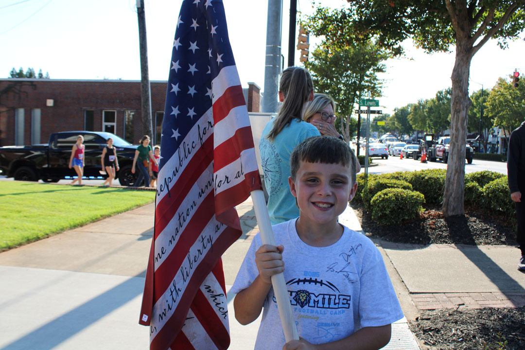 Grayson Moore, age eight, holds an American flag prior to the start of the Back the Blue K-9 One-Mile Run/Walk the evening of September 11, 2025. (Photo by Karen Brewer, The Pickens County Chronicle)