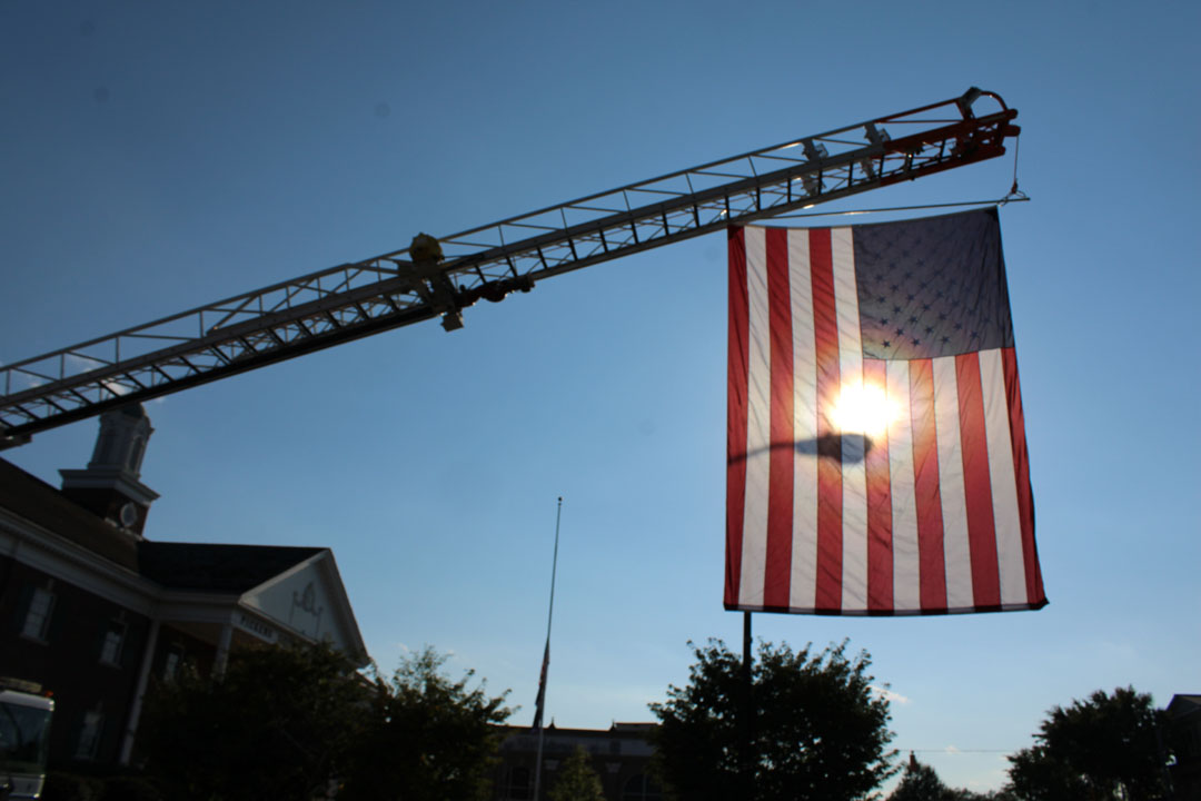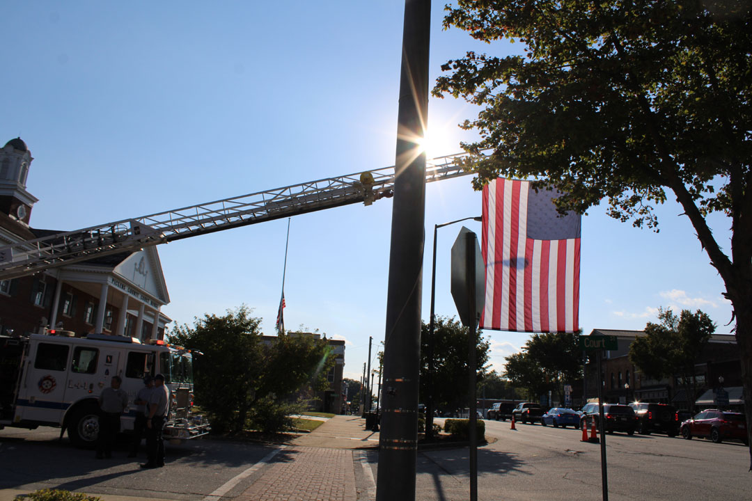 Firefighters Anthony Still, Jeff Howard, and Tyler Whitcomb raised a large American flag over Main Street in Pickens prior to the start of the Back the Blue K-9 Run/Walk the evening of September 11, 2025. (Photo by Karen Brewer, The Pickens County Chronicle)