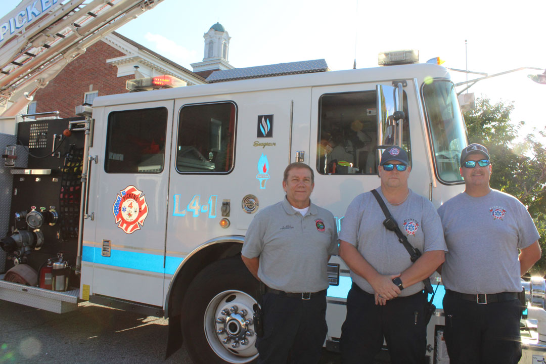 Firefighters Anthony Still, Jeff Howard, and Tyler Whitcomb pose for a photo before the start of the 2025 Back the Blue K-9 Run/Walk the evening of September 11. (Photo by Karen Brewer, The Pickens County Chronicle)