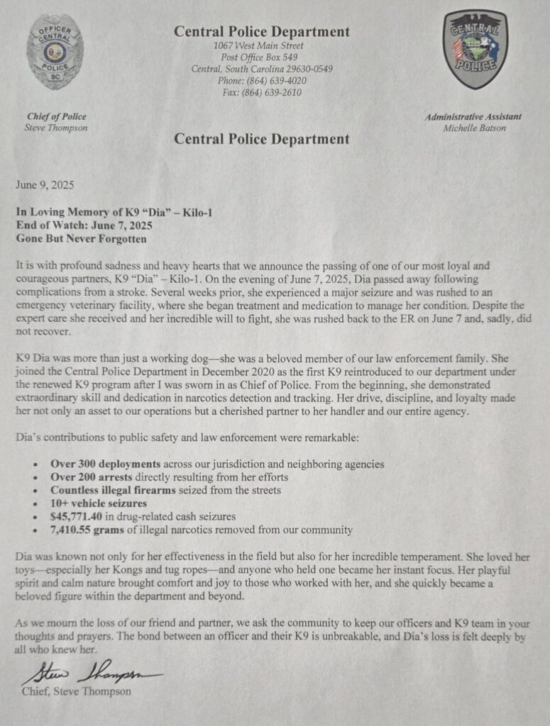 On June 9, 2025, the Central Police Department announced the passing of K-9 Dia on June 7. An announcement from Central Police Chief Steve Thompson can seen below in its entirety.