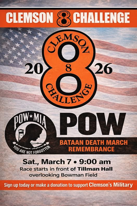 The 2026 Clemson 8 Challenge will be held on Saturday, March 7, with an opening ceremony at 9 a.m. The race will begin at Tillman Hall overlooking Bowman Field on the Clemson campus.