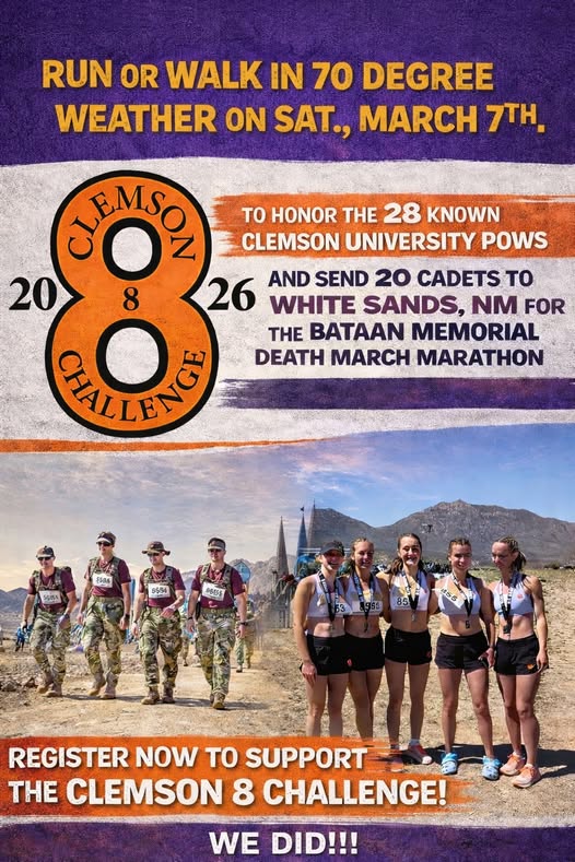 Help send 20 cadets to White Sands, New Mexico for the Bataan Memorial Death March Marathon. You do not have to be in Clemson to take the challenge. You can do your eight miles at home over as many as eight days.