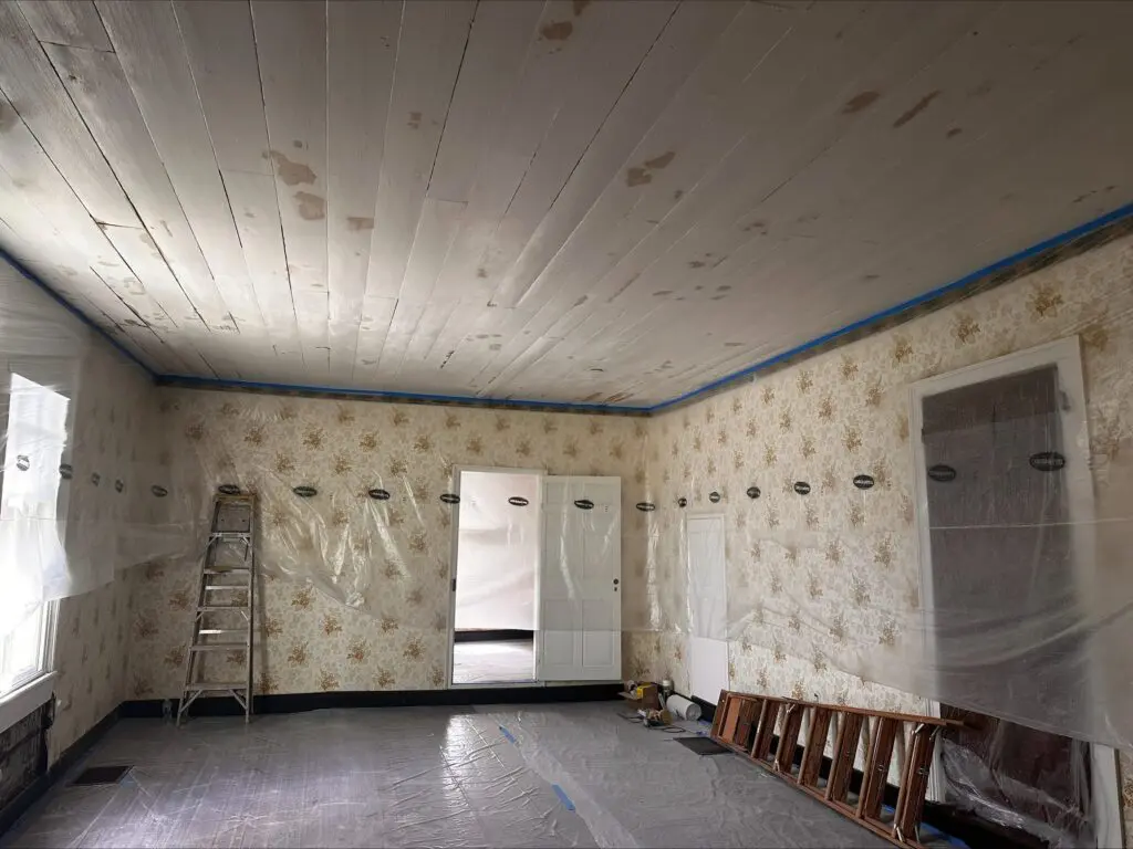 Most of the damage happened in the primary bedroom and the nursery on the first floor of the house due to a steam leak in the basement. Wallpaper will be replaced, the ceiling will be repainted, and some cracks in the walls and around the windows will be repaired. The hardwood floors will also be refinished throughout the first floor.