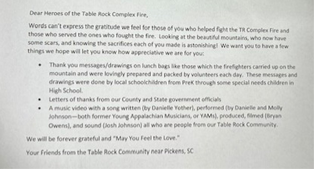 “After a more than two-week period of time, the fire was contained. First responders went home, people cleaned up, and some sense of normalcy returned. However, some people wanted to show their appreciation to our leaders, first responders, and the donors/volunteers who helped them. It was decided to mail/email gift packages (hard copies/virtual) to the first responder departments/organizations and the donor/volunteer organizations, restaurants, churches, and groups. These gift ‘packages’ contained cards from 1,200 school children in the Table Rock community, thank you letters from State Senator Rex Rice, State Representative Davey Hiott, and Pickens County Administrator Ken Roper, a link to a music video honoring our heroes and written, produced, and performed by local individuals, and an invite to the celebration on June 17.
