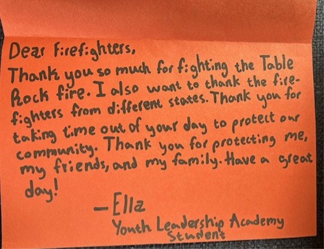 “The Table Rock Complex Fire tested us all, but it also revealed the extraordinary strength and resilience of our community. We are proud beyond measure of the collaboration displayed among local, state, and federal agencies, and equally moved by the outpouring of donations and support from our volunteers and citizens. Many worked long hours under dangerous and difficult conditions without hesitation, and many gave generously to ensure proper hydration and meals were provided to each person on site. You all embody the very best of public service and community spirit.