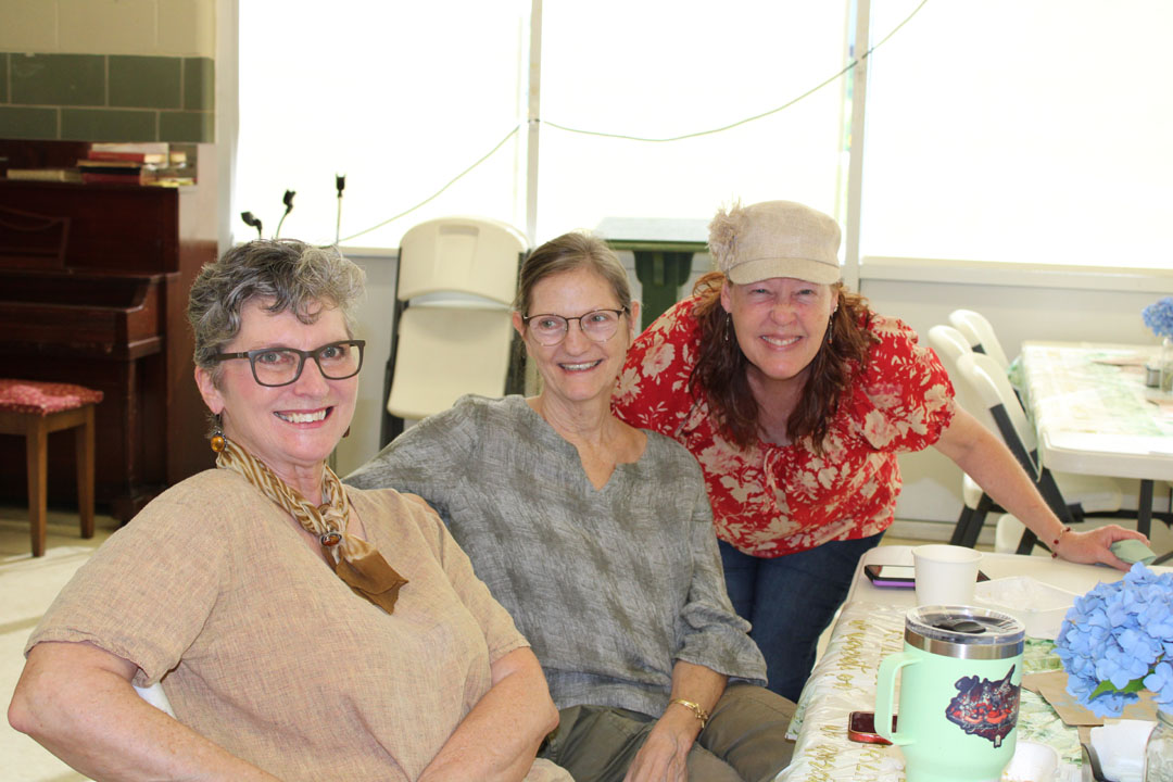 Karen Schneider, Karen Palladino, and Tara Porter (who helped pack lunches during the Table Rock Complex Fire) are pictured at the reception following the viewing of the "May You Feel the Love" tribute video at the Hagood Community Center in Pickens. (Photo by Karen Brewer, The Pickens County Chronicle)
