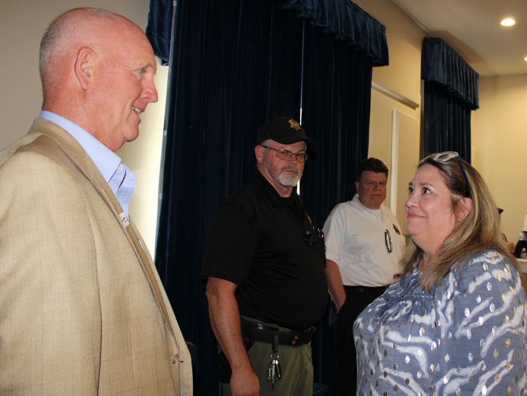 Following one of the viewings of the "May You Feel the Love" video on June 17, 2025, State Senator Rex Rice speaks with Tammy Anthony, who coordinated the meals during the Table Rock fire. (Photo by Karen Brewer, The Pickens County Chronicle)