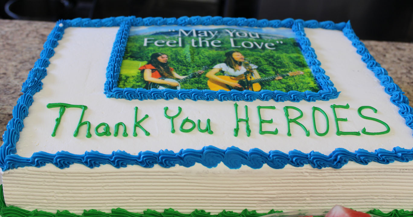 A cake served at the reception following the viewing of the "May You Feel the Love" video shows a photograph of Danielle Yother and Molly Johnson singing in the video and the words "Thank you, Heroes." (Photo by Karen Brewer, The Pickens County Chronicle)