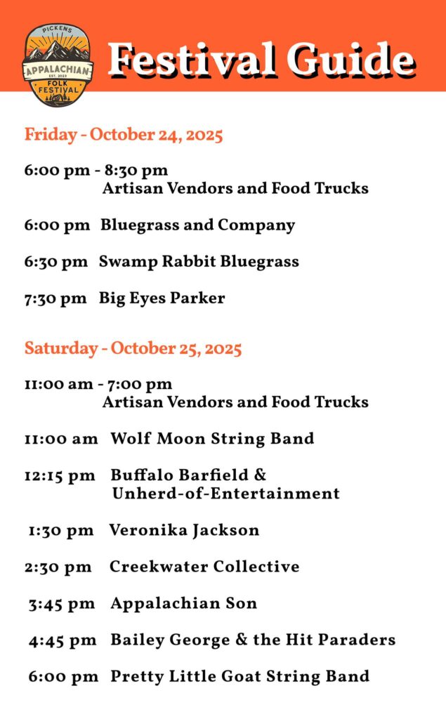 Here is the official band lineup for the 3rd annual Pickens Appalachian Folk Festival.