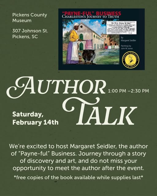 About the Book from the publisher, Evening Post Books: Winner of the 2025 Phillis Wheatley Book Award, “Payne-ful” Business: Charleston’s Journey to Truth follows Margaret Seidler’s mission to learn and process her family’s genealogical past. Using extensive research and personal experience, Seidler discusses the realities of Charleston’s racial history while highlighting the historians, journalists, and community members who work to reconcile those truths. The book features authentic, historic slave advertisements brought to life by vivid paintings by artist John W. Jones that uncover the humanity hidden beneath the detached advertisement descriptions. Seidler hopes that acknowledging a more complete truth about our past will motivate us to bridge today’s racial divide.