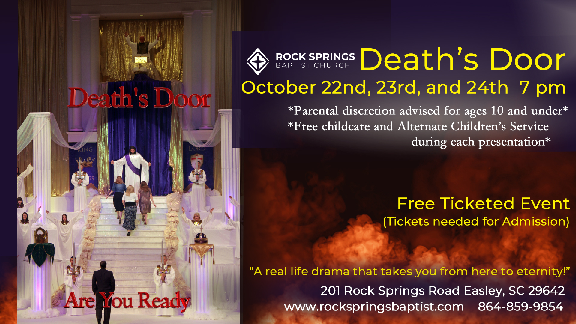 For more than a decade and a half, Rock Springs Baptist Church in Easley has held its annual drama, Death’s Door, which each year results in hundreds of decisions for Jesus Christ.