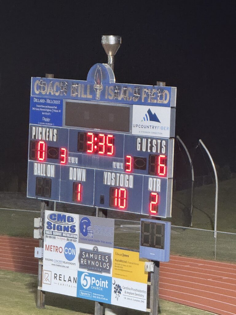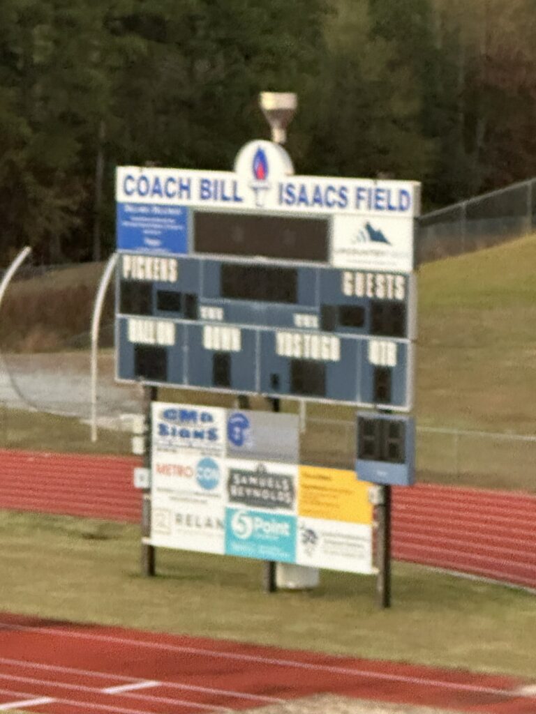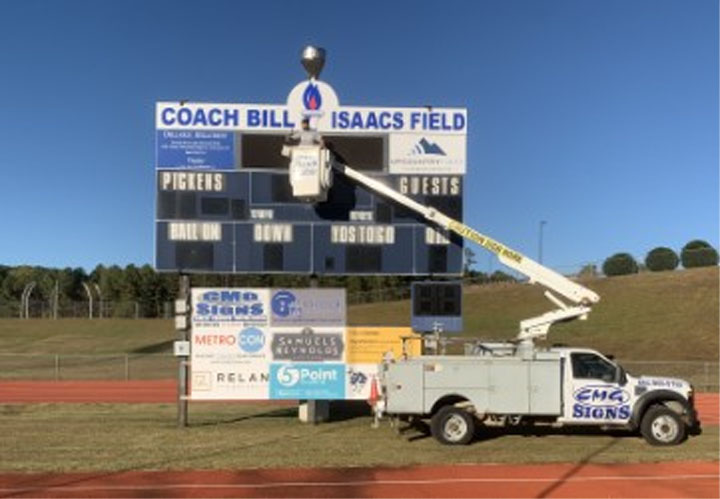The scoreboard at Pickens High School’s football stadium has new life after the letters designating Coach Bill Isaacs Field were replaced by Derrick Craft on Wednesday, October 22, 2025. Craft, a scoreboard sponsor and Booster Club donor, is a Liberty High School graduate but owns a business, CMG Signs, in Pickens, and he wanted to give back to the community as well as honor the memory of Pickens’ legendary football coach for whom the field at the current Pickens High School is named.